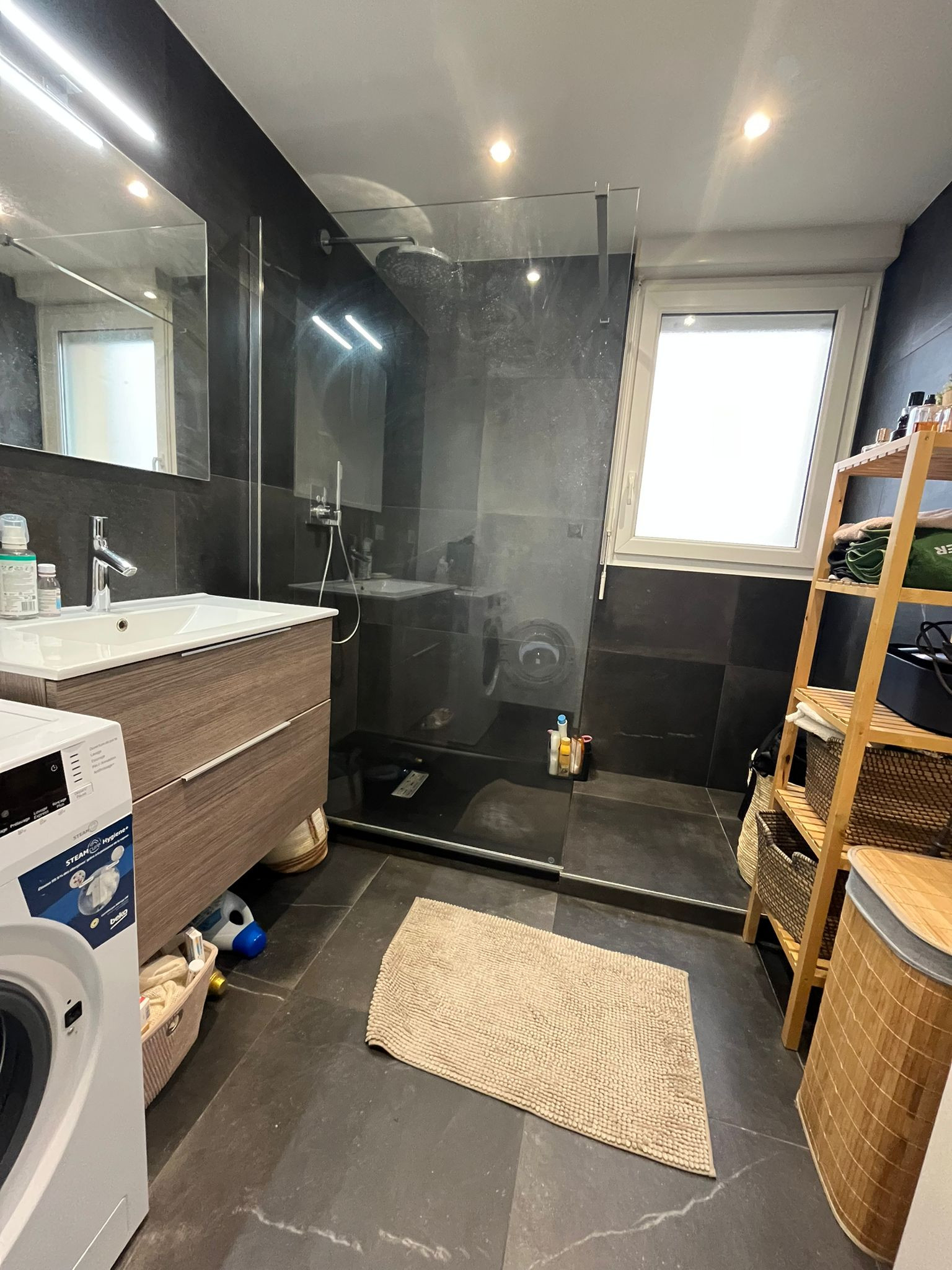 UNE ENTREE AVEC PLACARD MURAL, UNE CUISINE EQUIPEE (ELEMENTS FOURS PLAQUE HOTTE ) UN SALON SEJOUR DONNANT ACCES A UNE TERRASSE, DEUX CHAMBRES DONT UNE AVEC DRESSING, UNE SALLE DE BAINS EQUIPEE AVEC DOUCHE A L'ITALIENNE, UN WC SEPARE