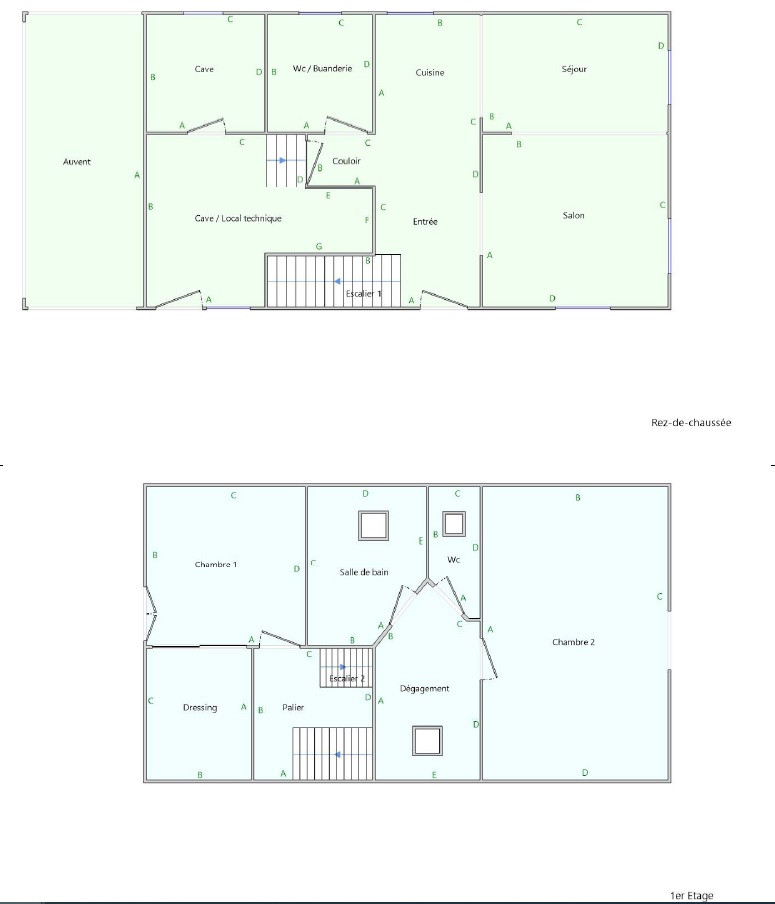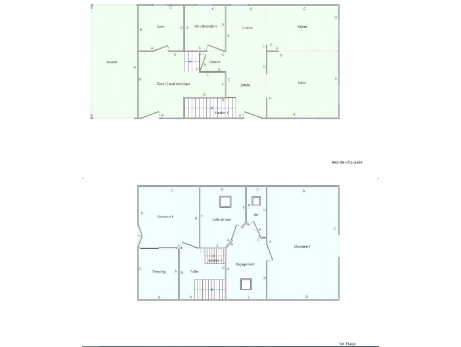 Au Rez-de-chaussée : une entrée avec un placard mural, une cuisine équipée ouverte sur un grand salon/séjour, une salle d'eau/buanderie (avec douche et WC), une pièce de rangement avec accès vers l'extérieur et une cave.