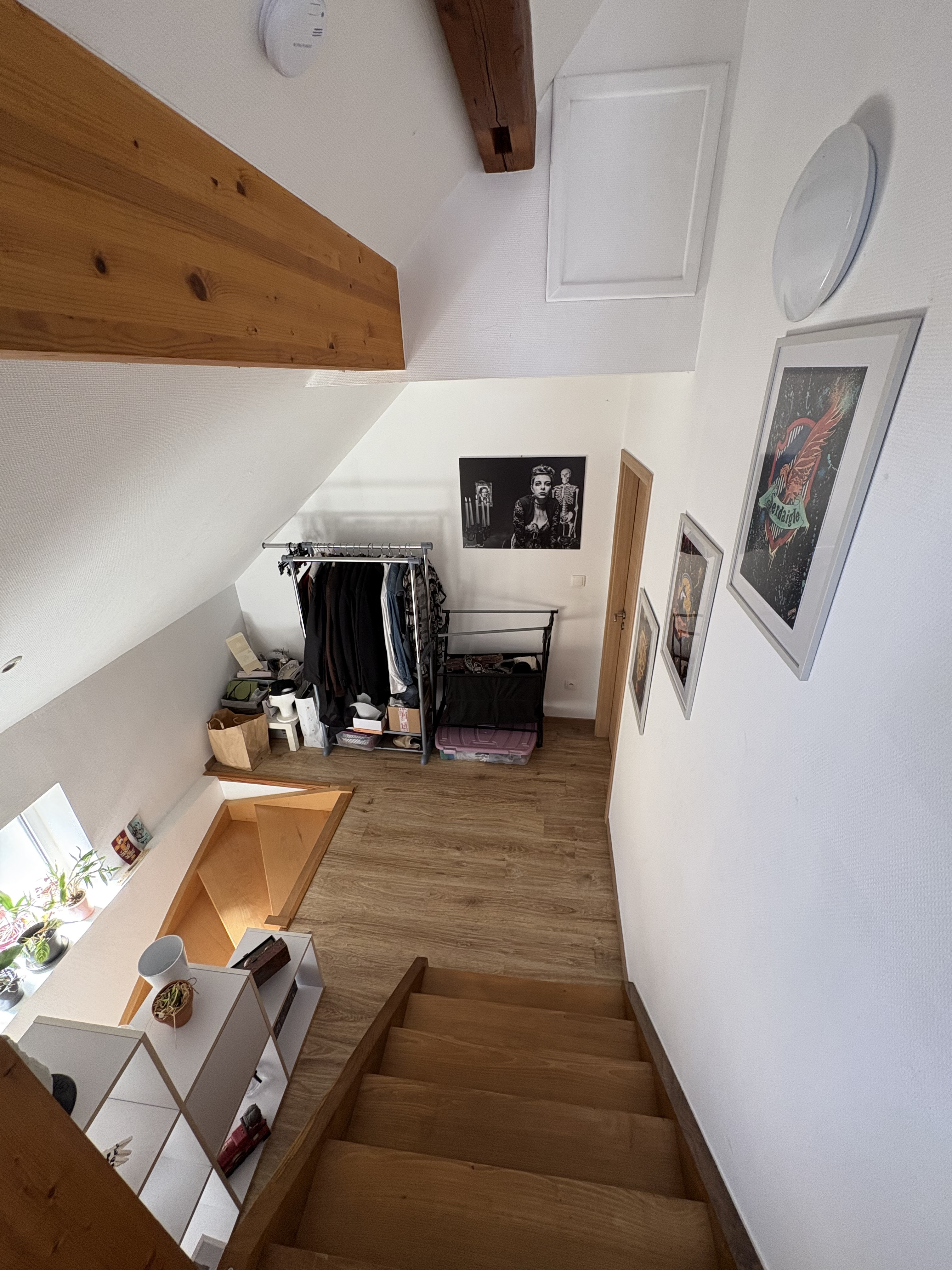 Au niveau intermédiaire : un palier et une grande chambre avec un dressing attenant.