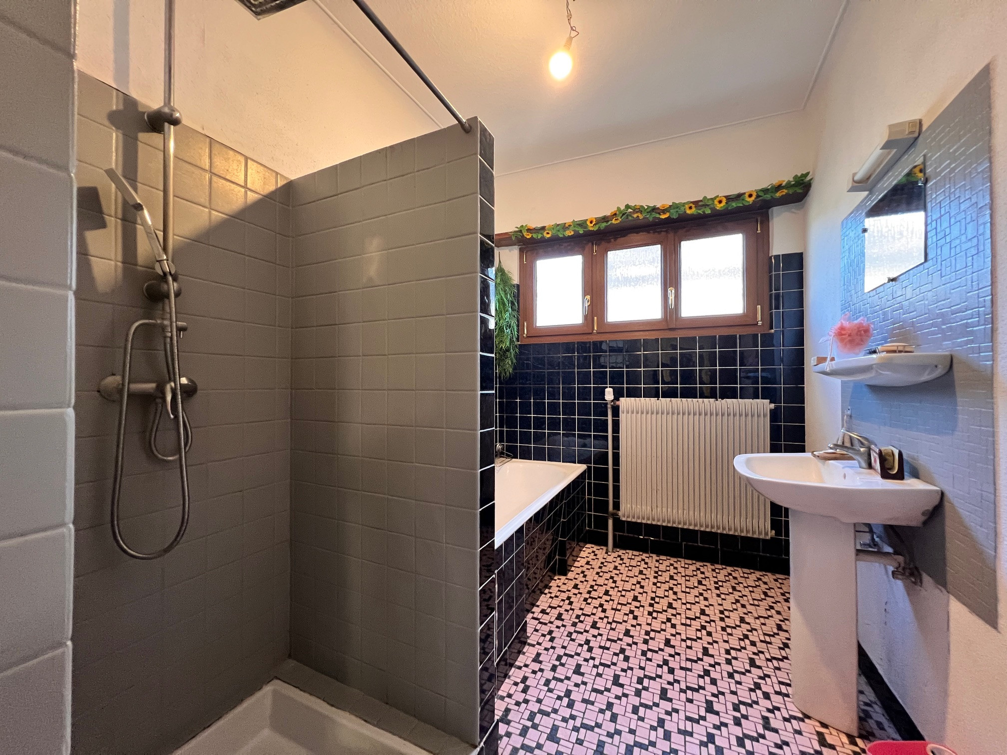 Chauffage par chaudière gaz et chauffe-eau thermodynamique (installation récente) + Kachelofen (poêle en faïence) , double vitrage en place, volets roulants électriques.